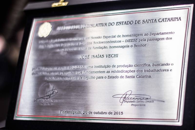 A solenidade, realizada no plenário da Assembleia Legislativa de Santa Catarina foi presidida e proposta pelo deputado estadual Dirceu Dresch e reuniu diversas lideranças de sindicatos de todo Estado, representantes das Centrais Sindicais e trabalhadores. Além da placa comemorativa como ex-diretor do Dieese, Vechi também recebeu uma menção ao representar a Central Força Sindical SC, uma das entidades lembradas na sessão.