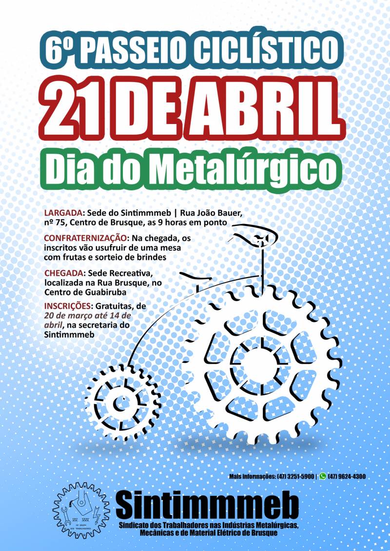 O Sindicato dos Trabalhadores nas Indústrias Metalúrgicas, Mecânicas e de Material Elétrico de Brusque (Sintimmmeb), desde segunda-feira, 20 de março, está com inscrições abertas para a sexta edição do Passeio Ciclístico dos Metalúrgicos.