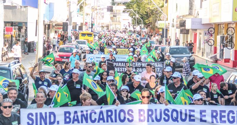As movimentações em Brusque iniciaram bem cedo. Das 4 horas da manhã até às 5h30, o terminal de ônibus do município teve as atividades paralisadas. Por volta das 9 horas, os manifestantes caminharam pelas ruas do Centro e, em seguida, entraram nos bancos Bradesco e Caixa Econômica Federal, onde o atendimento foi paralisado por meia hora.