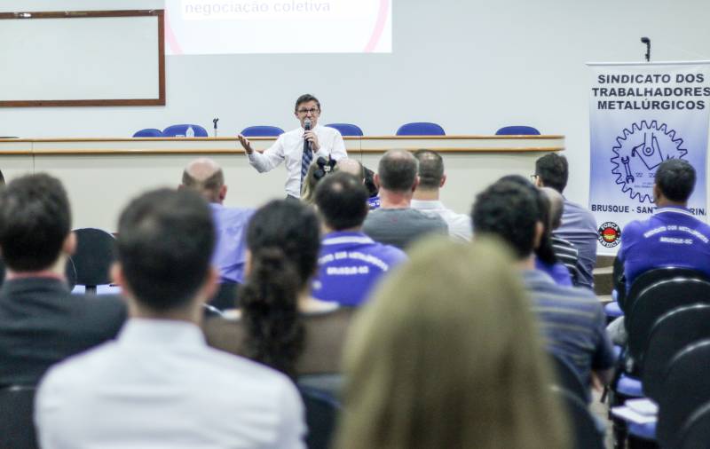 O auditório do Sindicato dos Trabalhadores Metalúrgicos de Brusque (Sintimmmeb) recebeu na noite desta quinta-feira, 5 de outubro, Luiz Carlos Roveda, ex-Juiz do Trabalho de Itajaí e de Brusque, que falou sobre a Reforma Trabalhista e as mudanças na CLT (Consolidação das Leis de Trabalho). O evento, aberto ao público, recebeu juristas, lideranças sindicais de diversas regiões do Estado, advogados, estudantes e trabalhadores.