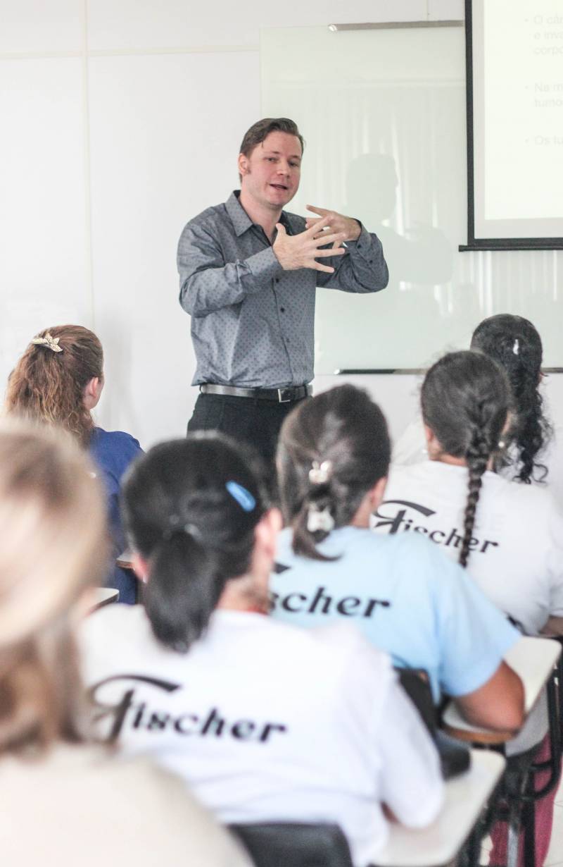 O Dr. Gustavo explicou o que é o câncer de mama e abordou os sintomas e fatores de risco, como funciona a mamografia, a importância do diagnóstico precoce, tratamento e prevenção da doença. Cerca de 60 funcionárias ouviram atentamente às informações no auditório preparado para a palestra.