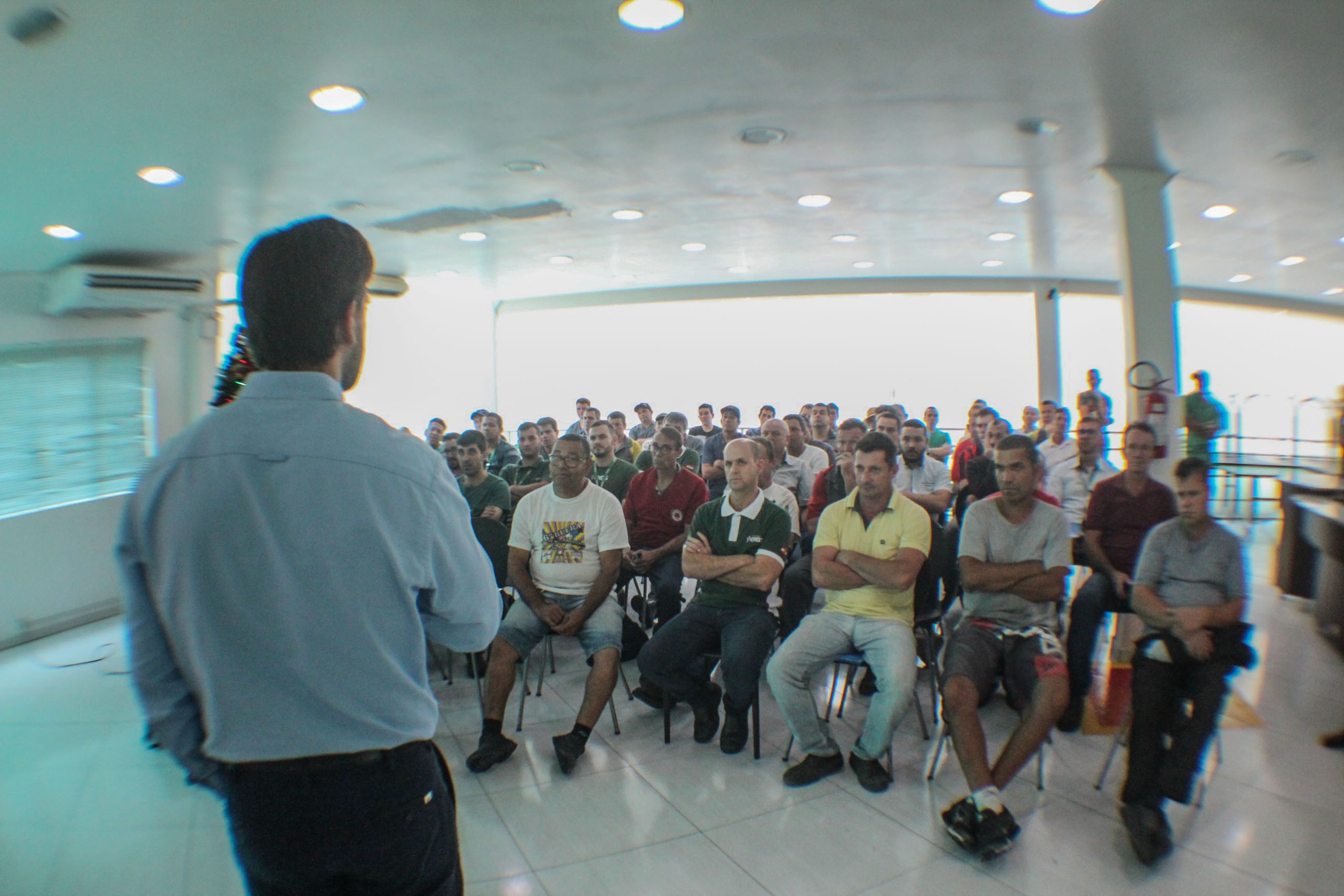 Trabalhadores da empresa Baterias Erbs, em Botuverá, assistem palestra da Sintimmmeb Saúde sobre o Novembro Azul